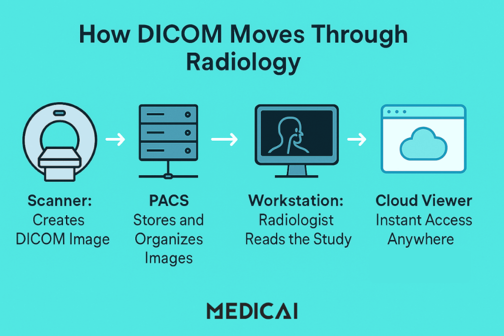 DICOM-Dateien bewegen sich in einer Radiologie-Abteilung auf einem sorgfältig strukturierten Pfad. Jeder Schritt, vom Erfassen eines Bildes bis zum Anzeigen auf einem Arbeitsplatz, hängt davon ab, dass dieser Standard reibungslos funktioniert.