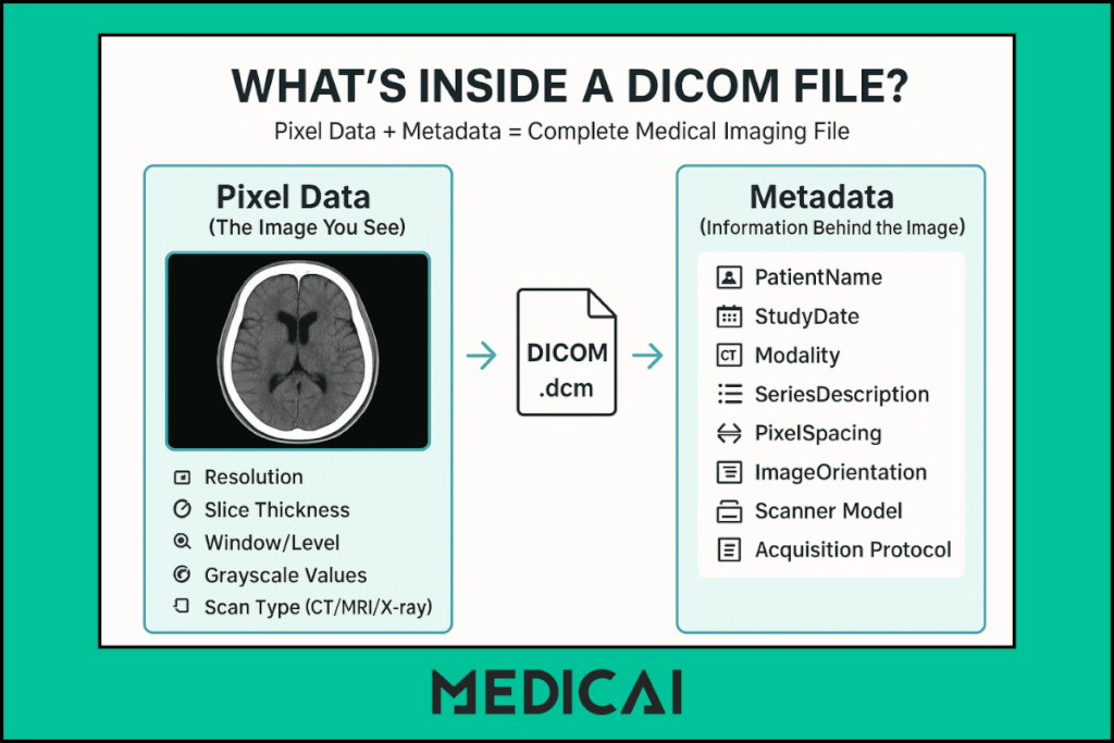 Die Pixel-Daten sind das, was der Radiologe sieht. Die Metadaten helfen ihm zu verstehen, wem das Bild gehört, wie der Scan gemacht wurde und was er sich ansieht.