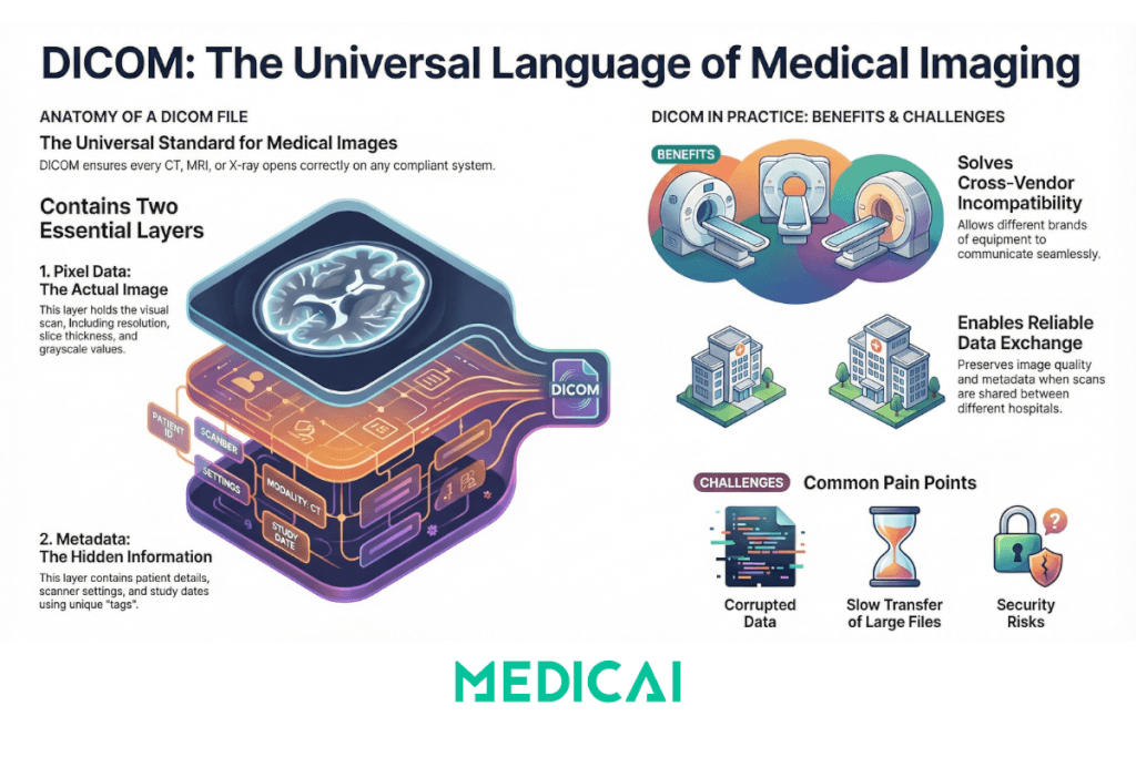 Schließlich ermöglicht DICOM einen reibungslosen Übergang zwischen Scannern, PACS-Systemen und Betrachtern. Ein CT-Scan, der in einer Einrichtung aufgenommen wurde, kann sofort in einer anderen angesehen, in einem Tumorboard verwendet oder in einem Cloud-Betrachter wie Medicai ohne Konvertierungen oder Qualitätsverlust geöffnet werden.
