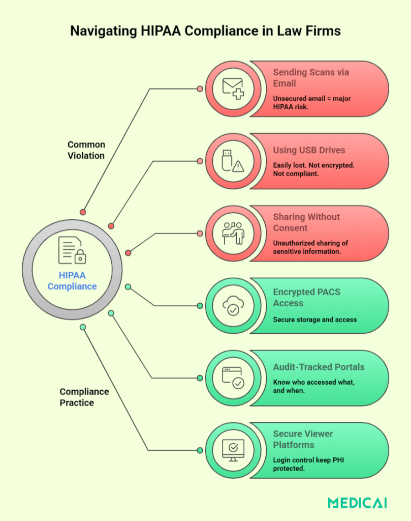 Ein unsachgemäßer Umgang mit medizinischen Bildern oder anderen geschützten Gesundheitsinformationen (PHI) kann zu hohen Geldstrafen, Reputationsschäden und Verlust des Kundenvertrauens führen. Anwälte müssen die Risiken verstehen, um sicherere und konformere Praktiken aufzubauen.