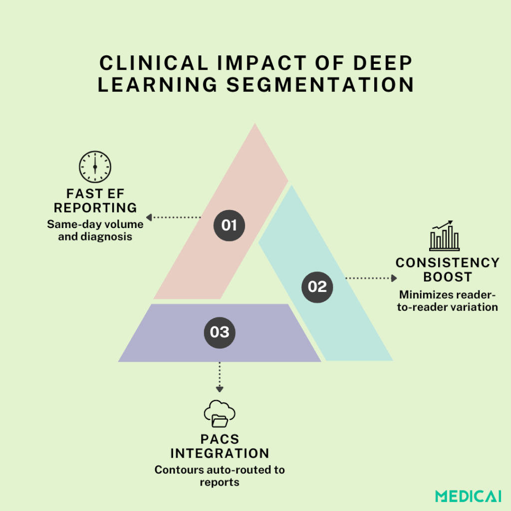 Durch die Bereitstellung genauer ventrikulärer Volumina innerhalb von Sekunden ermöglicht die KI-gestützte Segmentierung die sofortige Berechnung des enddiastolischen Volumens (EDV), des endsystolischen Volumens (ESV) und der Ejektionsfraktion (EF). Diese schnelle Bearbeitung beschleunigt die Diagnosen und unterstützt rechtzeitige Anpassungen der Behandlung ohne Verzögerungen beim manuellen Nachzeichnen.