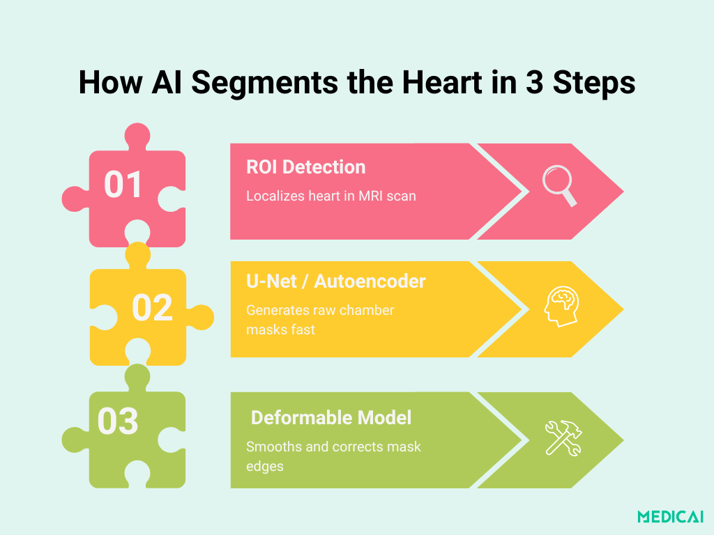 Automatisiertes Deep Learning ermöglicht eine schnelle und genaue Segmentierung von Herzkammern in der Herz-MRT und bietet in Sekunden präzise Umrisse. Es kombiniert CNN zur Lokalisierung, U-Net zur Verarbeitung und deformierbare Modelle zur Verfeinerung, um Kliniker:innen zuverlässige Ergebnisse zu liefern.