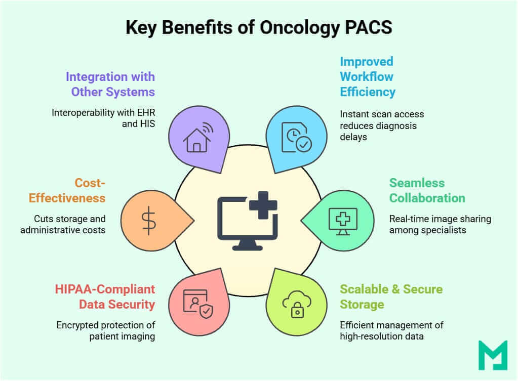 DICOM-compliant PACS enables hospitals and cancer centers to share imaging data securely across departments and external facilities.