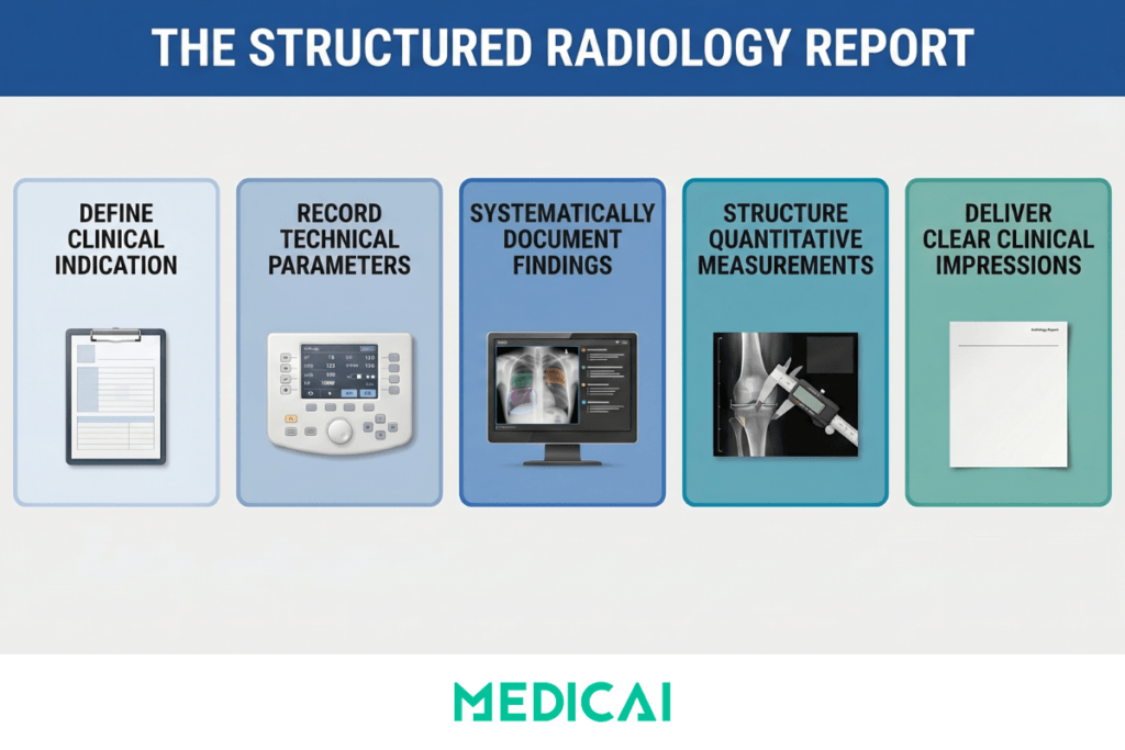 A well-structured radiology report has six mandatory sections. Each section has a specific function in the clinical and operational workflow, and omitting any of them results in an incomplete report for at least one downstream use case.