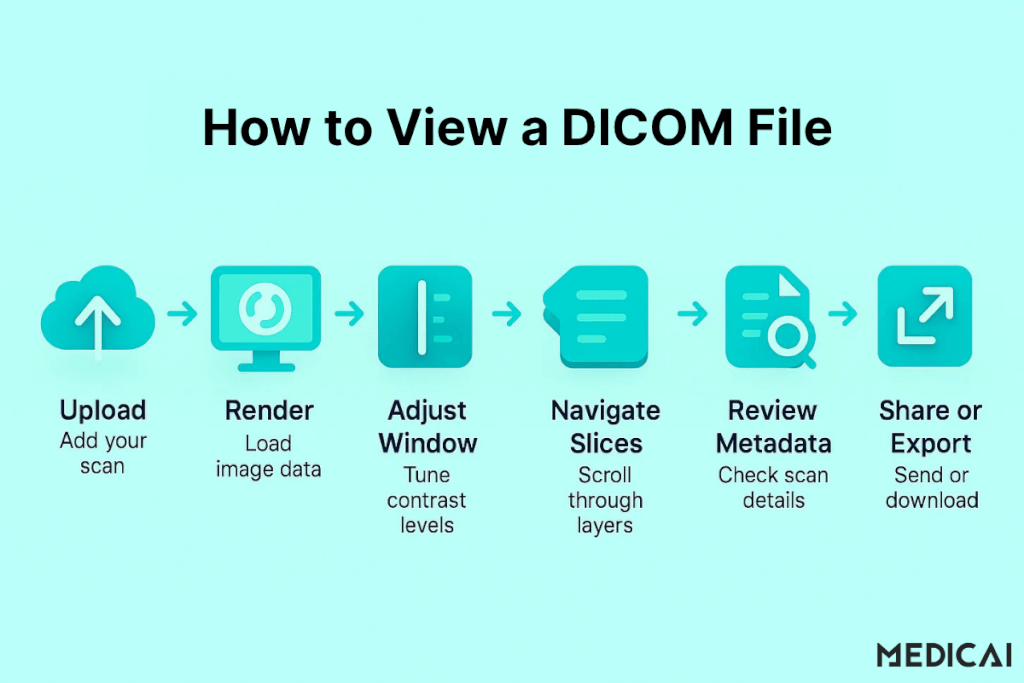 Las plataformas modernas en la nube como Medicai siguen estos estándares DICOM, asegurando que las imágenes aparezcan consistentes ya sea que se vean en una estación de trabajo de hospital o en un navegador.