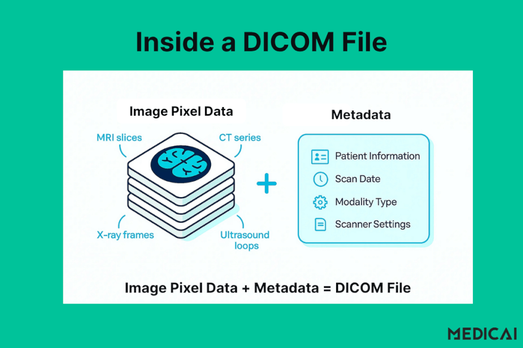 Un archivo DICOM aparece como una imagen regular, pero contiene una capa oculta de metadatos que lo transforma en un registro médico confiable.