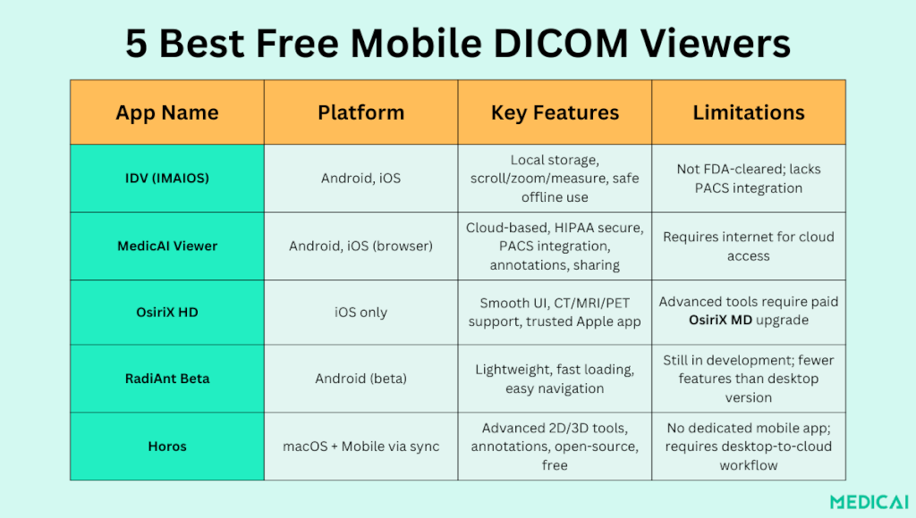 Los visores basados en la nube, como Medicai, llevan esto un paso más allá al funcionar directamente en navegadores móviles, eliminando la necesidad de descargas.