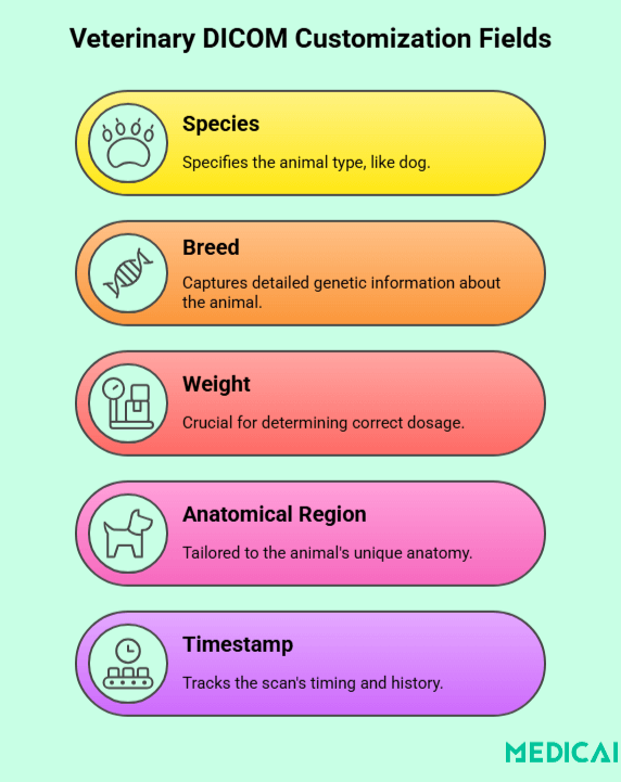La médecine vétérinaire implique diverses espèces et types corporels, qui peuvent ne pas être entièrement soutenus par les champs DICOM standard. Pour garantir l’exactitude des dossiers, utilisez un logiciel qui permet des métadonnées flexibles pour l’espèce, la race et l’anatomie.
