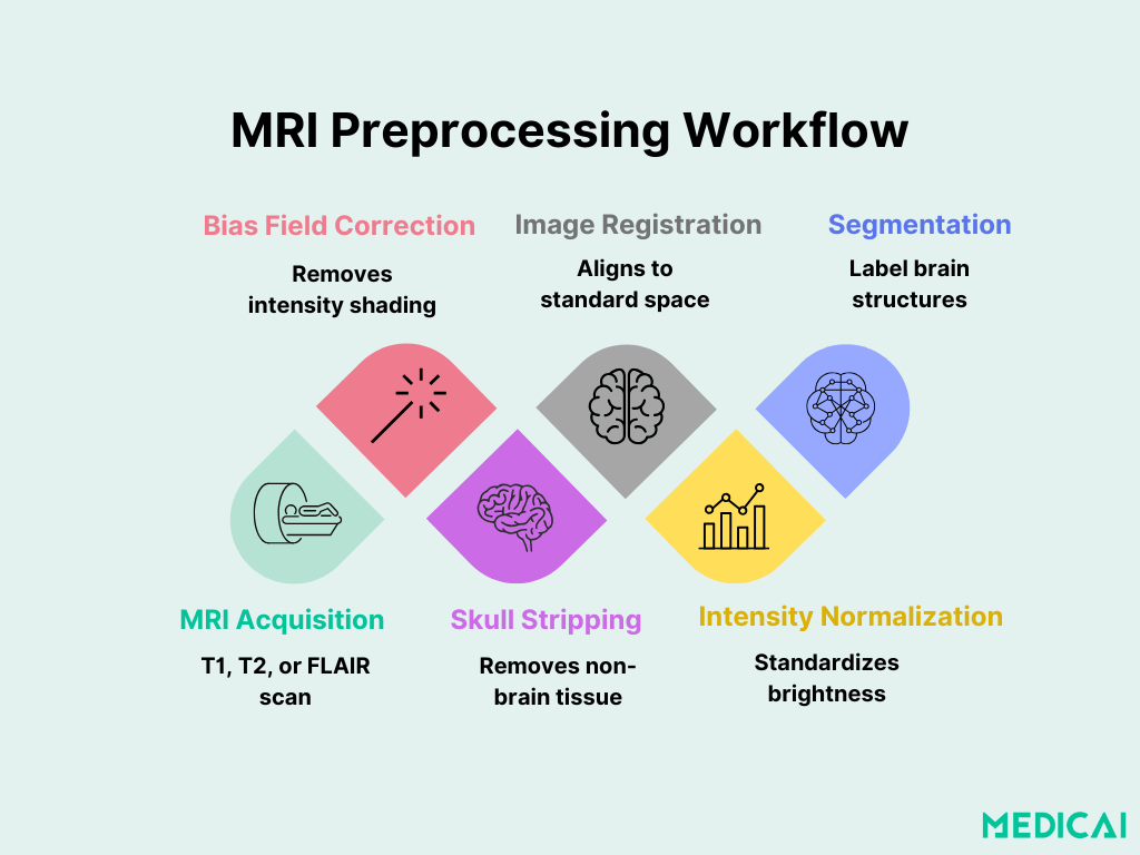 - Correction du champ de biais – L’inhomogénéité d’intensité est corrigée à l’aide d’outils comme N4ITK (Normalisation non paramétrique non uniforme de l’intensité).