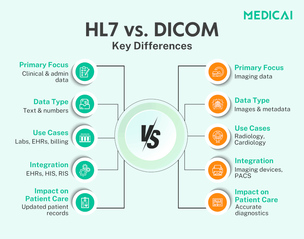 HL7 și DICOM sunt cruciale pentru IT-ul din domeniul sănătății, dar se concentrează pe aspecte diferite ale datelor și fluxurilor de lucru în sănătate. În timp ce HL7 gestionează datele clinice și administrative, DICOM se specializează în imagistica medicală,.