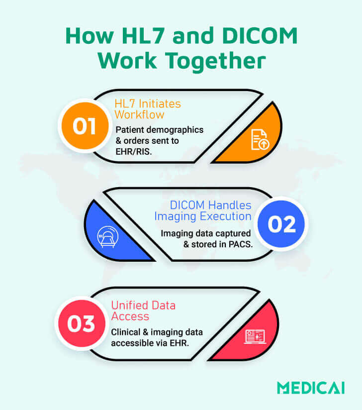 DICOM și HL7 servesc scopuri distincte; totuși, integrarea corectă este crucială pentru un flux de lucru eficient și unificat. Integrarea HL7 și DICOM asigură că furnizorii de sănătate au o vedere holistică asupra stării pacientului, îmbunătățind acuratețea și eficiența diagnosticelor.